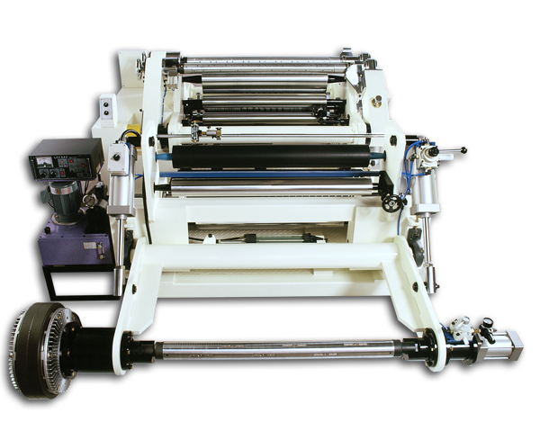 본 기종은 모던기종에 사용되는 범용 SLITTER로서 소폭으로 크게 감을 수 있는 Slitter 입니다. 1개의 축을 받침으로 하여 상호 1개씩 Touch 되면서 Rewinder되는 형식이고 Powder Clutch에 의한 매감속장력 조절이 되게 설계되어 있습니다.